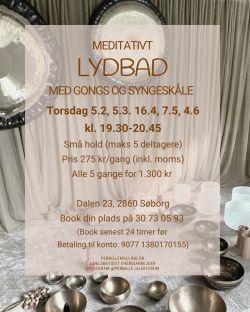 Passer datoerne ikke, kan du altid booke et privat lydbad for dig og dine – skriv til mig, så finder vi en tid.