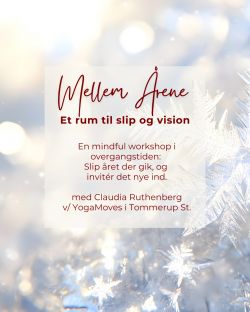 I workshoppen Mellem Årene samler du op på året med taknemmelighed, slipper det der tynger, bevæger kroppen, deler, visualiserer, griner sikkert også – og inviterer det nye år ind med klarhed og lethed. Det bliver et kærligt rum med yoga, refleksion, små ritualer og bevægelse eller dans, så du kan gå ind i 2026 grounded, åben og med skaberkraft.