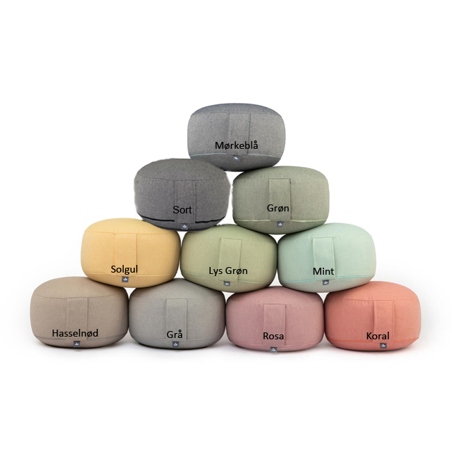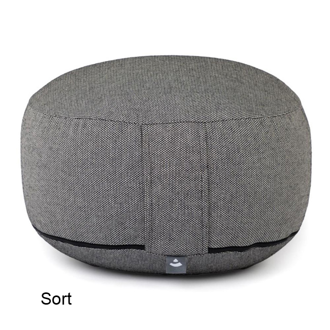 Rund meditationspude med aftageligt betræk. Det ydre betræk har et praktisk håndtag til. Speltskallerne i puden tilpasser sig godt til kroppen. Højden på puden kan let justeres ved at fjerne noget af fyldet.
