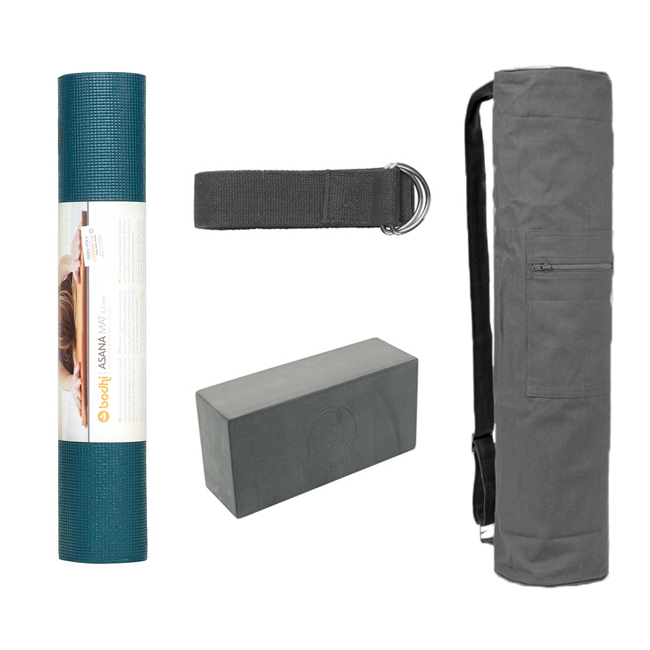 Yoga Startsæt Plus indeholder alt, hvad du behøver for at komme både godt og nemt i gang med yoga.
